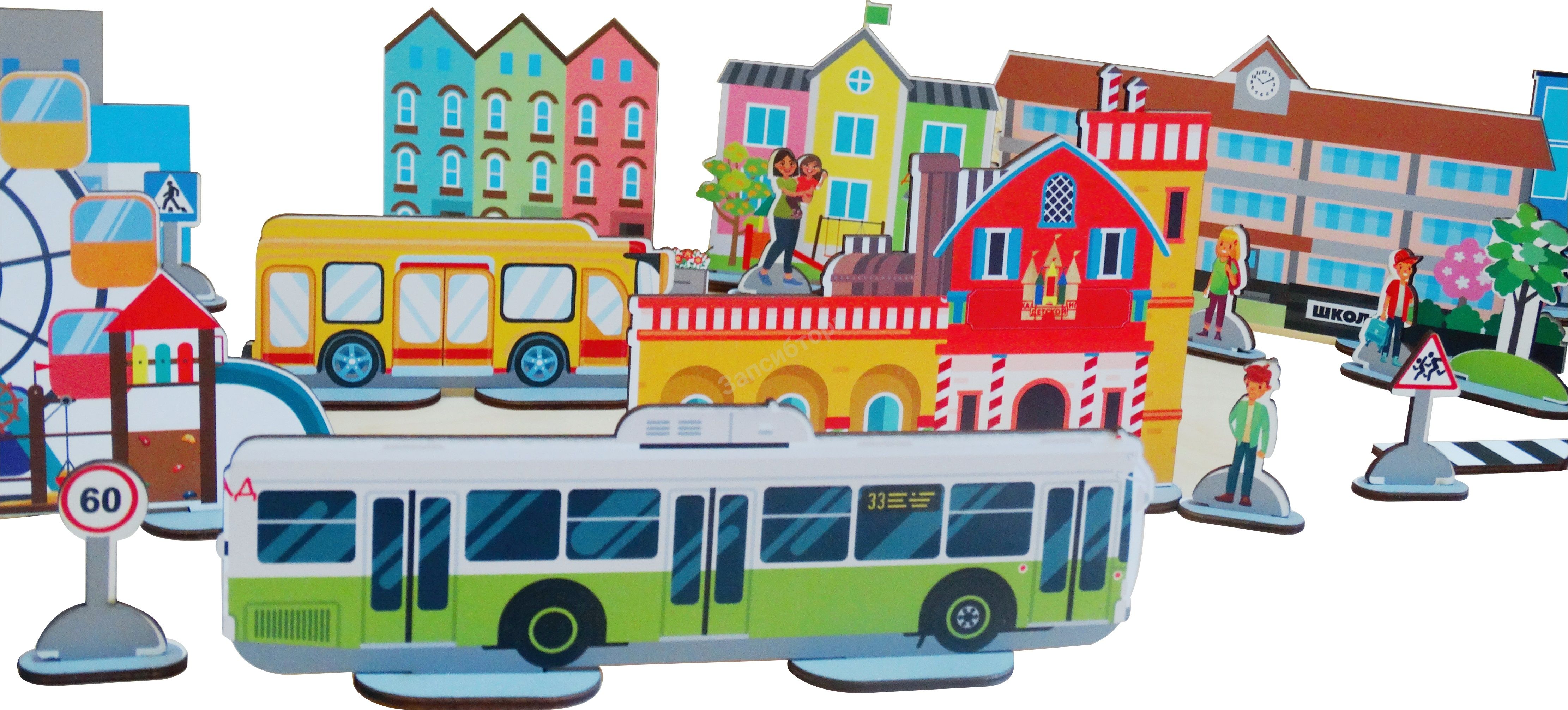 Цветной деревянный конструктор знакомит с инфраструктурой города, помогает расширить кругозор. В конструкторе представлены фигурки для строительства миниатюрных парков, больниц, улиц. Воображаемый город наполнится изображениями людей, машин, дорожных знаков, фонтанов, скамеек, зданий, деревьев.