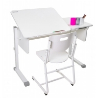 Снизу стол дополнен антивандальным экраном и боковыми панелями с закругленными краями. Сумку можно повесить на крючок. У парты телескопические опоры с полозьями.