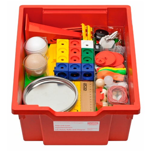 Материалы предоставляются в пластмассовом боксе, поэтому их удобно хранить и транспортировать. В комплект также включены карты-схемы, по которым дети могут сами проводить опыт, и методическое пособие для педагогов и воспитателей.