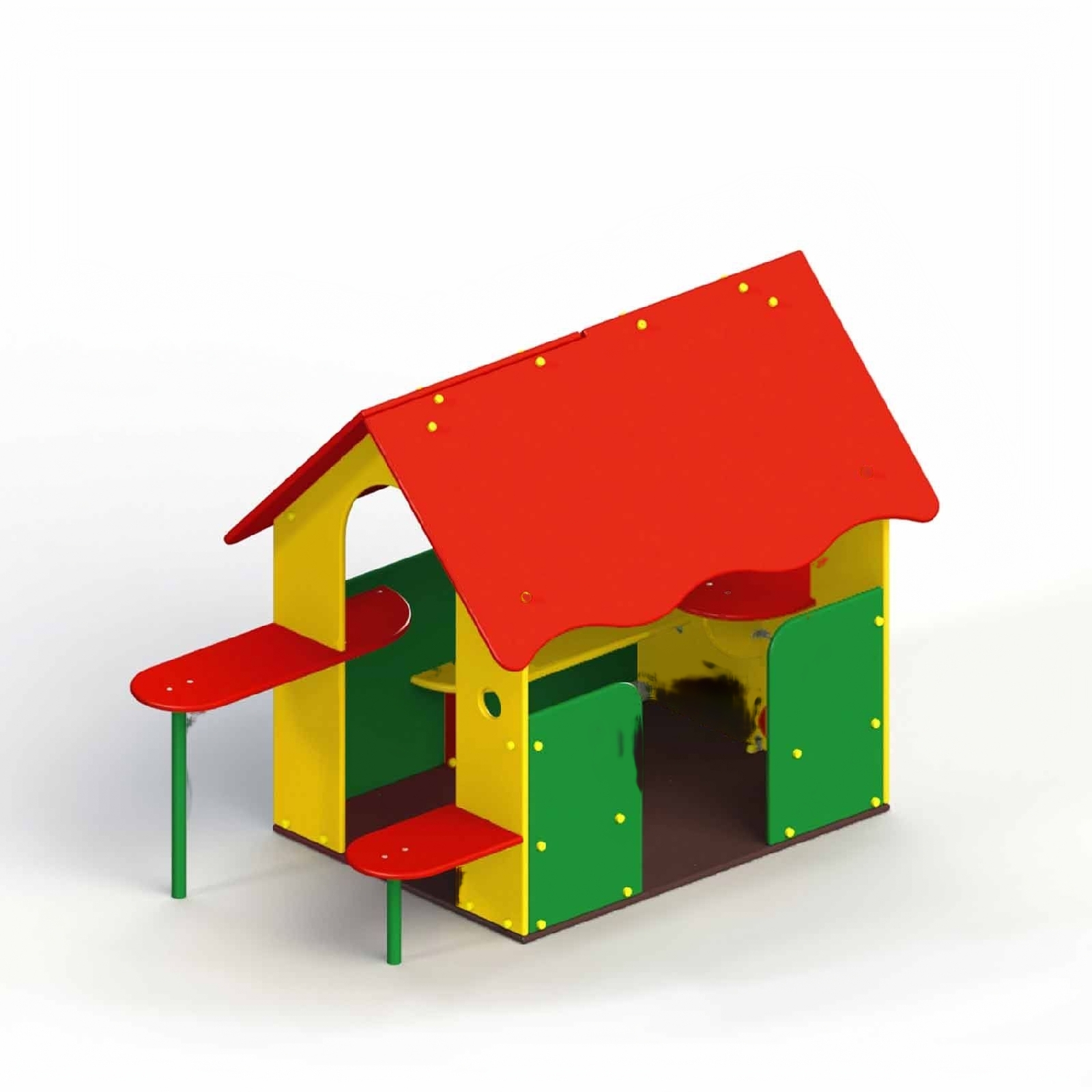 Уличный домик оснащен угловыми сиденьями, скамейкой, окном и подоконником, входной аркой, проемом между ограждениями, фигурными столиками на стойках, d 42 мм. Пол сделан из фанеры. Низ 2-скатной крыши волнообразный.