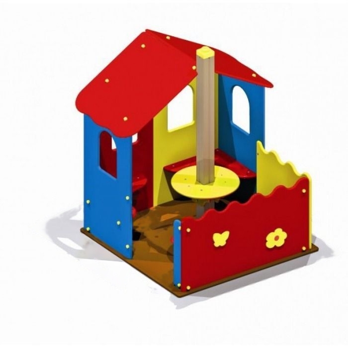 Опорный столб из клееного бруса бетонируется в землю, вокруг центральной оси закрепляется столешница. Пол выполняется из нескользящей фанеры. На стенах закрепляется угловое сиденье. Домик прикрывается скатами влагостойкой фанерной крыши. Ограждения палисадника с волнообразными верхними краями дополняются декором в виде цветочков и бабочек.