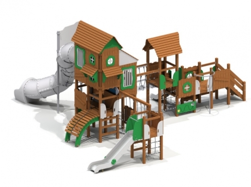 В спортивной зоне есть горки (открытые нержавеющие, тоннельная), вертикальный шест, подвесной мост, сетки для лазанья, тактильный лабиринт, лестницы, трап-барабан с канатом. Боковые панели украшены окнами или отверстиями. Крыши защищают башни от дождя. Конструкция опирается на деревянные и металлические столбы.