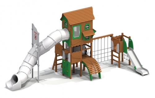 Игровая зона с разными видами горок (тоннельная, открытая нержавеющая) опирается на несущие столбы. Альпинистская стенка, канат над трапом-барабаном, вертикальная сетка, лестницы с перекладинами помогут укрепить мышцы, победить страх высоты. Ограждения площадок дополнены окошками.