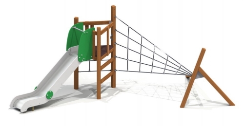 В комплексе для физического развития есть перекладины, горка, сетка для лазанья. Разновысокие несущие столбы (наклонные и вертикальные) дополнены креплениями для канатов. Площадка без крыши огорожена. Перед нержавеющим скатом с бортиками установлена защитная секция.