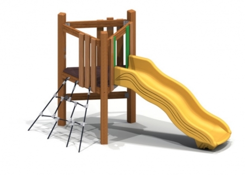 Конструкция с пластиковой горкой дополнена сеткой для лазанья. Площадка без крыши опирается на высокие столбы. Корпус усилен перекладинами. Волнообразный скат окружен бортиками. Сетка устанавливается под наклоном.
