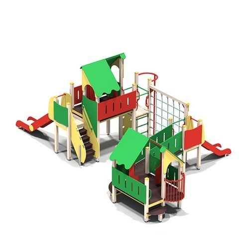 Уличное игровое оборудование для территории ДОУ включает: 3 башни, 2 полубашни, радиусные площадки, вертикальная сетка, волнообразный мост, ограждения, перегородки, поручни, 2 горки, шест со спиралью, лестница.