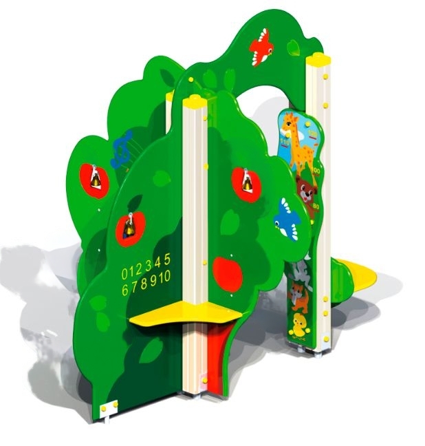 Представляет собой стенд с росписью в виде животных и маркировкой роста ребенка. Панель с «бубликами» и цилиндрами для игры в «крестикм-нолики» представляет собой пластиковые или деревянные бублики, цилиндры, закрепленные на металлических перекладинах из трубы D 26 мм.