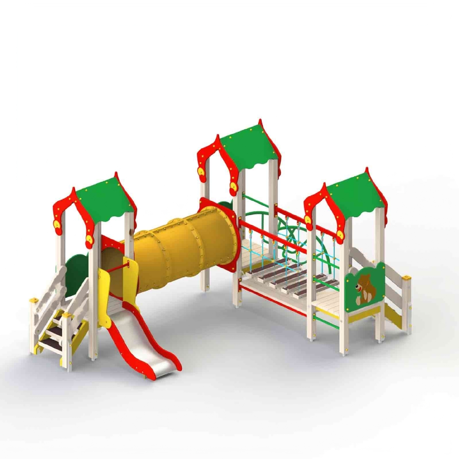 - горка со стальным скатом толщиной 1.5 мм, фанерными бортами (h 100 мм), защитной секцией и перекладиной (d 33 мм).