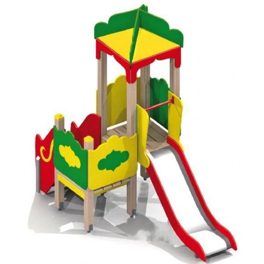 В составе комплекса: крытая башня, горка, лестница, крыша, ограждения, перекладина.