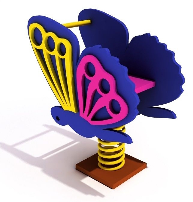 Детская качалка с поручнями оформлена в виде бабочки. Между боковыми панелями установлена скамья со спинкой. Конструкция устойчива к воздействию вибраций. Пружина под каркасом крепится к основанию.