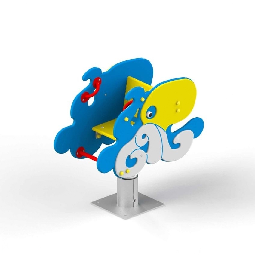Детская качалка на пружине оснащена корпусом в виде осьминога. Между 2-х стилизованных панелей установлено сиденье со спинкой. Место для ребенка оборудовано 2-мя поручнями (d 21 мм) и подставкой для ног (d 26 мм). Основание, опорные плиты, раскосы выполнены из металлических листов (5 мм). Жесткость конструкции придает дополнительная перекладина.