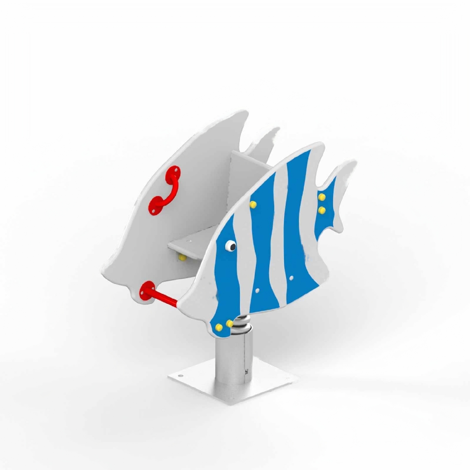Балансир с панелями в виде рыбки качается на оцинкованной пружине (d 26 мм). Конструкция усилена перекладиной жесткости. Фанерный корпус оснащен сиденьем и спинкой. Установку дополняют поручни (d 21 мм), опоры для ног.