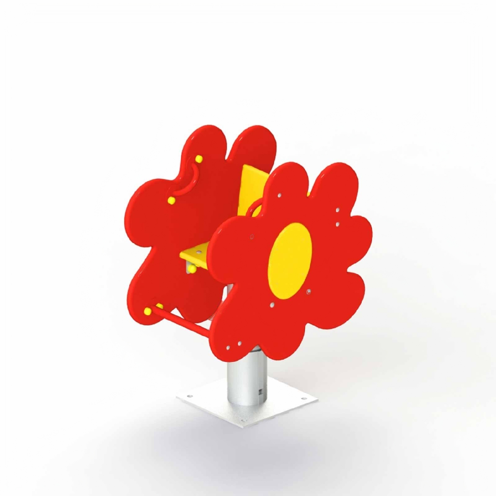 Качалка на виброустойчивой пружине(d 26 мм), оснащена боковыми панелями в виде цветка. Фанерное посадочное место дополнено спинкой. Чтобы держаться, есть 2 поручня и опора из трубы. Конструкция усилена перекладиной жесткости.