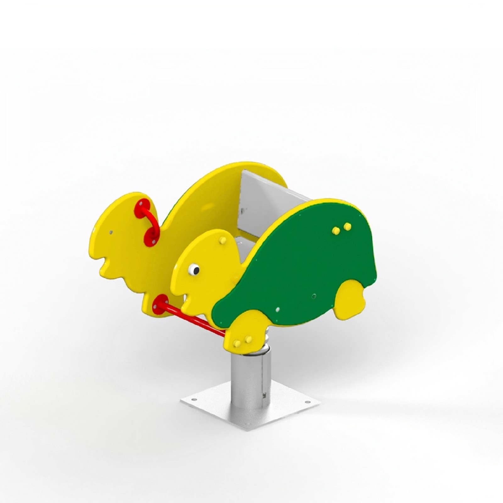 Балансир с оцинкованной пружиной (d 26 мм) оснащен поручнями и опорой для ног. Боковые панели конструкции выполнены в виде черепахи. Между ними закрепляется фанерное посадочное место со спинкой. Корпус усилен перекладиной жесткости. Пружина держится между 2-мя пластинами из металла.