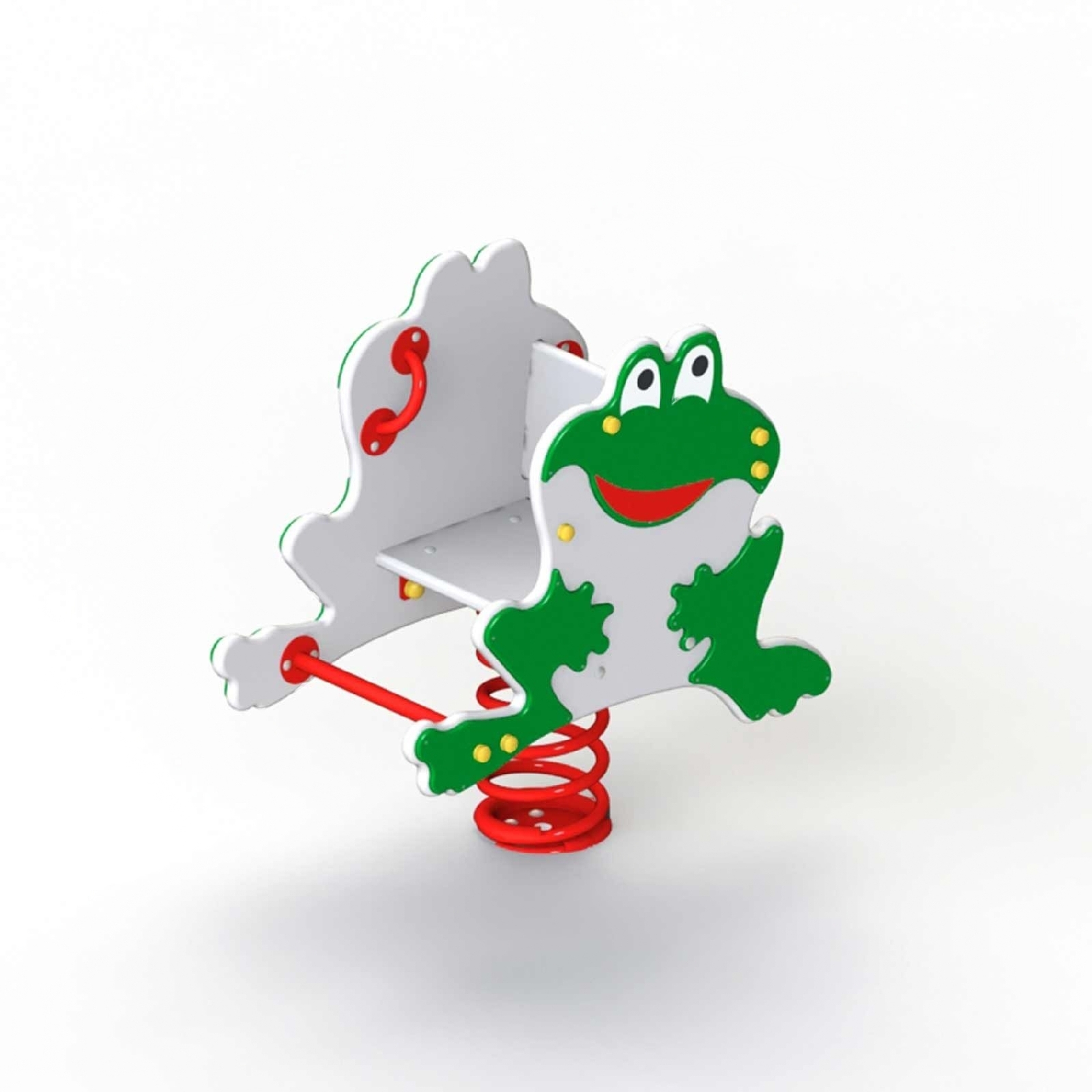 Качалка с боковыми стенками в виде лягушки оборудована одним сиденьем со спинкой. Впереди 2 поручня (d 21 мм). Нижняя перекладина служит подставкой для ног (d 26 мм). Для жесткости корпус оснащен соединительной трубой. Основание с опорными плитами и раскосы изготовлены из листов металла (5 мм).