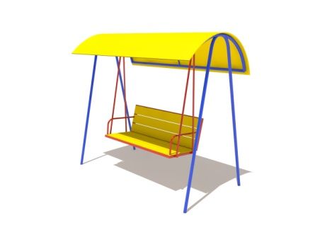 Качели для 4-х человек выполнены в форме скамьи на металлических подвесах. Сиденье и спинка отшлифованы. Подвесы закрепляются на каркасе с цветной крышей, вращаются на подшипниках. 4 стойки бетонируются в грунт. Металл покрыт порошковой краской.