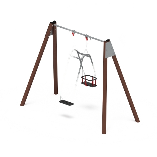 Каркас окрашен порошковой краской, все швы тщательно обработаны. Качели позволяют кататься ребенку вместе со взрослым. Монтаж производится путем бетонирования, размер площадки должен быть не менее 3100х7700 мм. Изделие устойчиво к воздействию атмосферных осадков.