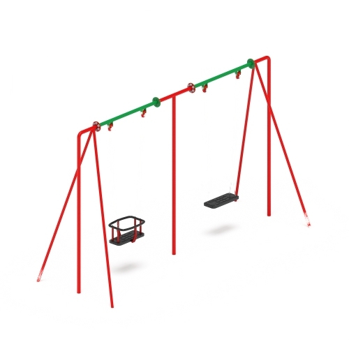 Каркас окрашен порошковой краской, все швы тщательно обработаны. Наличие 2-х видов сидений позволяет использовать качели как совсем маленьким, так и детям постарше. Монтаж производится путем бетонирования, размер площадки должен быть не менее 3200х6950 мм.