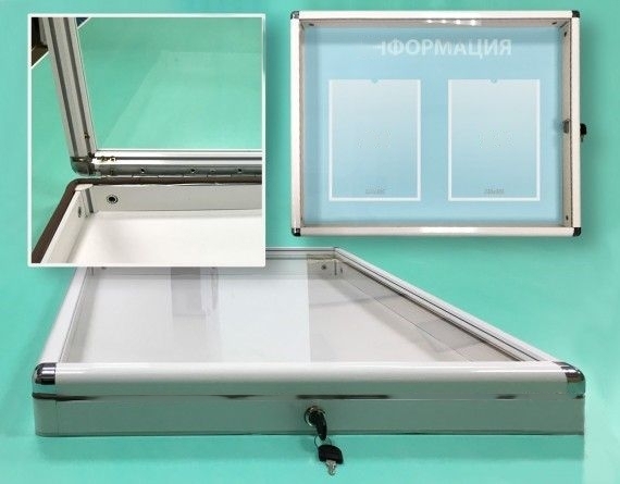 Материал: алюминиевый профиль, пластик ПВХ (3 мм), оргстекло (4 мм), ПЭТ (толщина кармана 0,5 мм, крепление на двусторонний скотч).