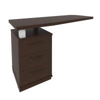Тумба с криволинейным топом используется в кабинете муниципального учреждения. Изделие ставится слева или справа от криволинейного стола. Топ на стойке из трубы квадратного сечения возвышается над корпусом с 3-мя выдвижными ящиками (верхний на замке). Пространство между поверхностью топа и верхом корпуса используется для хранения предметов, как и ящики. Топ выполняет функцию дополнительной столешницы. Ручки на фасадах ящиков металлические. ЛДСП отделана кромкой (0,4 и 2 мм) в цвет мебели.