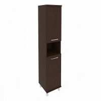 Узкий шкаф с центральной нишей и 2-мя фасадами оснащается дверцами и фурнитурой. ЛДСП отделана кромкой (0,4 и 2 мм) в цвет мебели. Шкаф для бумаг стоит на высоких регулируемых опорах из металла. Створки открываются направо или налево.