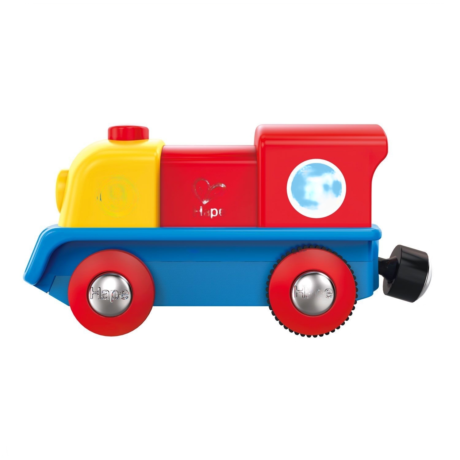Паровозик оснащён кнопкой включения/выключения, которая удобна для детских пальцев. В задней части игрушки размещён магнит, с помощью которого можно крепить вагоны. Для работы необходимы две батарейки типа ААА (в комплект не входят). Игрушка поможет в развитии моторики рук и координации движений, навыка распознавания цвета.