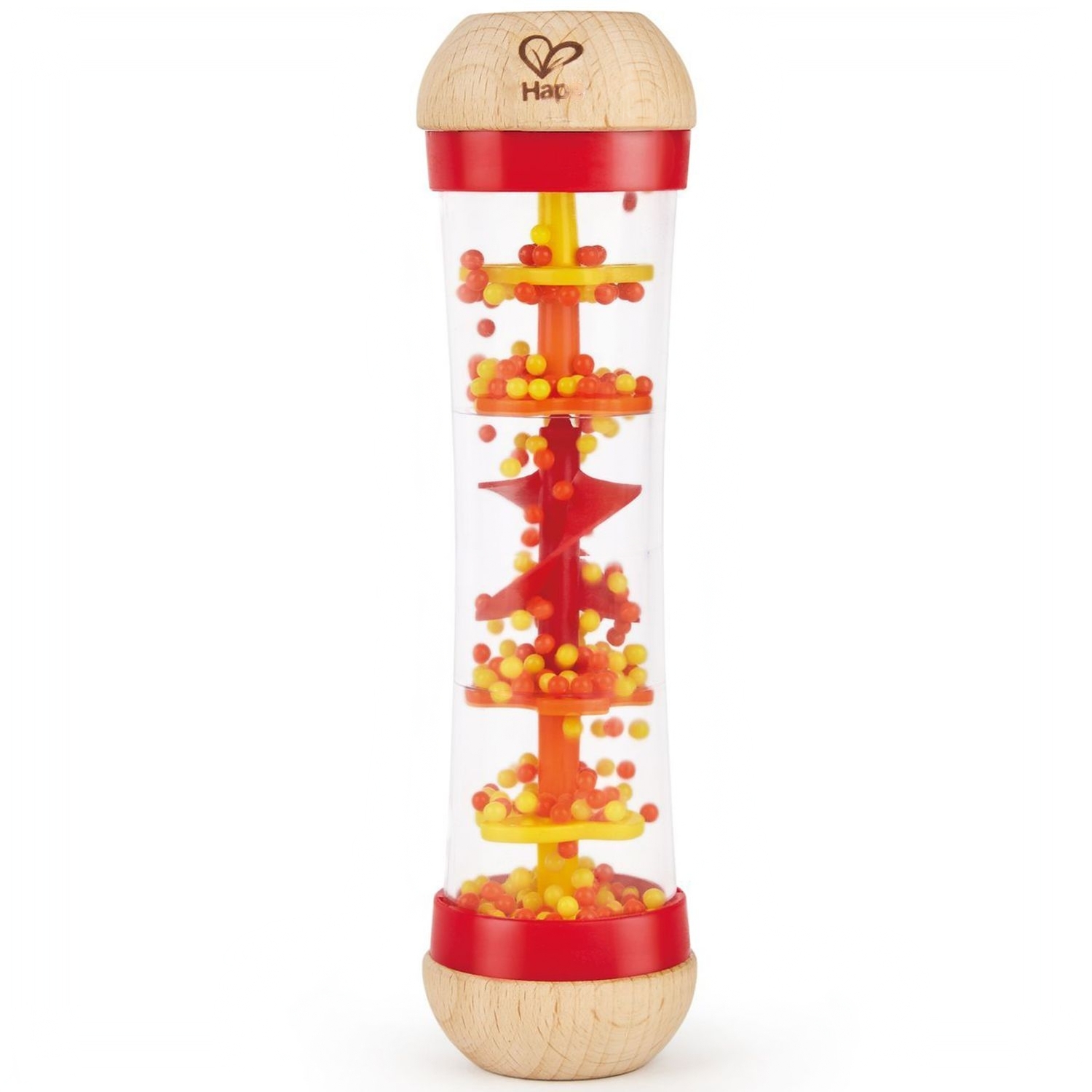 Если перевернуть игрушку, польётся бисерный дождик с успокаивающими звуками. Предмет идеально подойдёт для тренировки зрения и слуха. Форма игрушки разработана специально для детских рук.