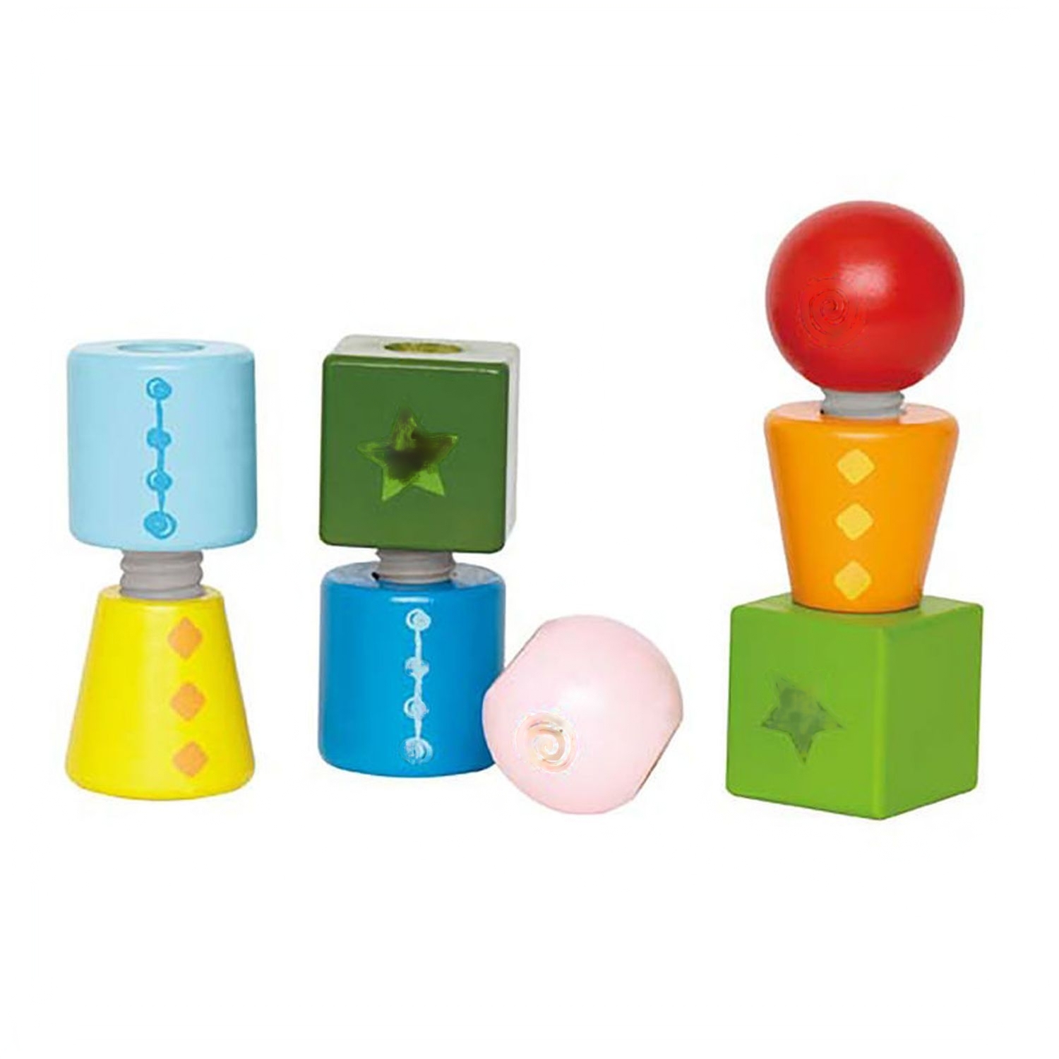 Игрушка состоит из восьми различных по цвету и форме блоков, которые нужно соединить друг с другом с помощью винтовых креплений. Способствует развитию ловкости, координации, моторики рук и навыков распознавания цвета.