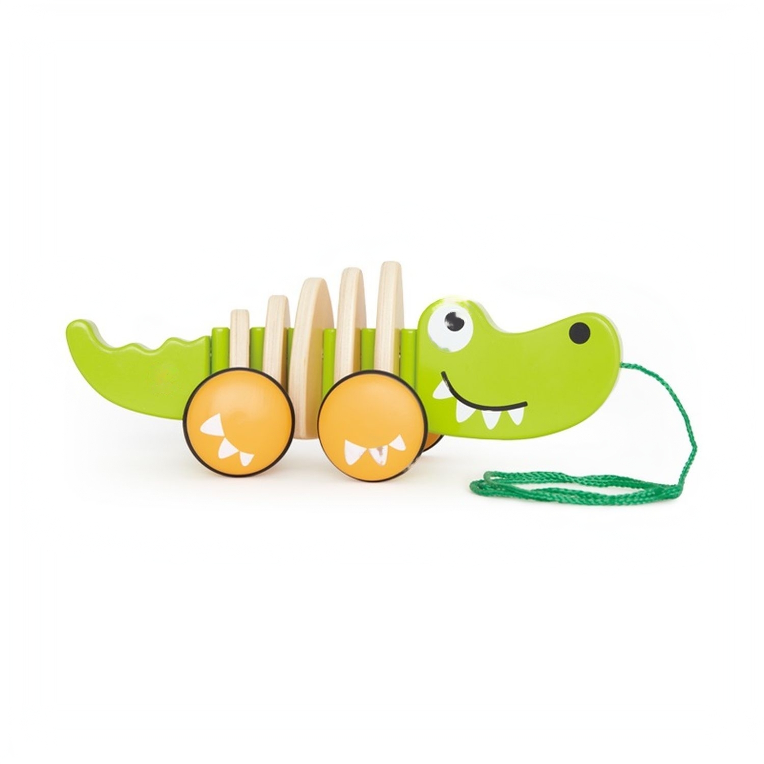 Игрушка оборудована 4-мя прорезиненными колесами и крепким шнурком. За счет подвижной задней части, при перемещении крокодил виляет хвостиком.