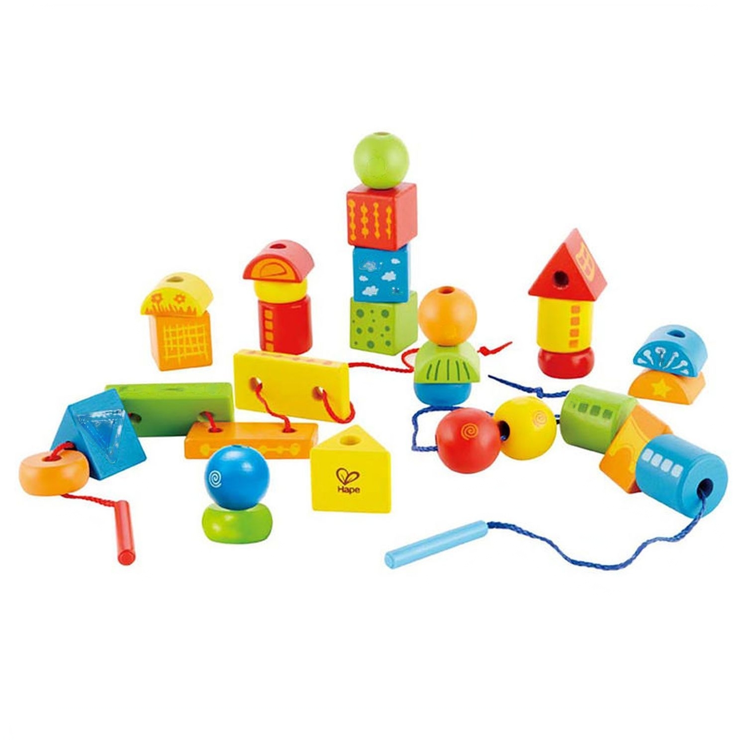 Конструктор состоит из нити и 32 деревянных блоков, различных по цвету и форме. Элементы легко нанизываются на шнурок, и дети могут создавать большое количество комбинаций.