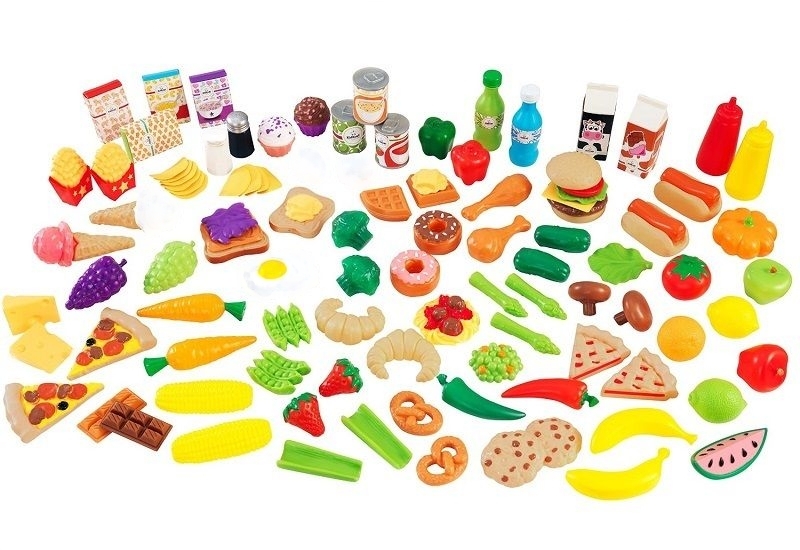 Набор состоит из 115 муляжей различных продуктов питания: фруктов, выпечки, овощей, напитков, сладостей и т.д. Может использоваться в качестве дидактического материала и аксессуаров к сюжетно-ролевым играм.