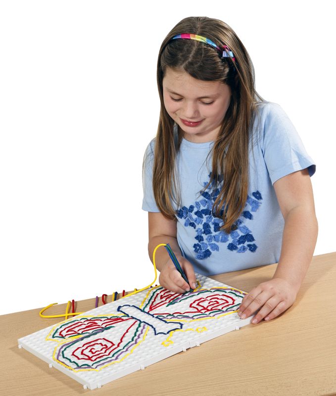 Панели могут скрепляться между собой и вешаться на стену. Флуоресцентные шнурки светятся под воздействием ультрафиолетовых лучей. Набор стимулирует творческое мышление детей и развивает мелкую моторику рук.