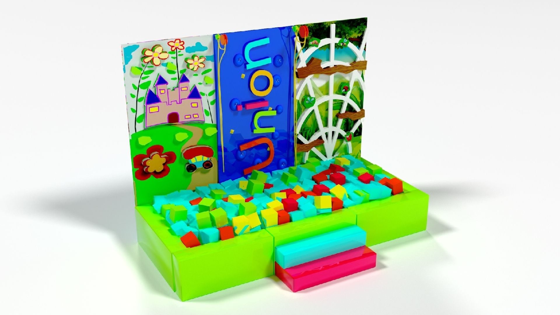 Комплекс для ДОУ представлен панелями для лазания и сухим бассейном с поролоновыми кубиками. К площадке ведут разноцветные ступени. Скалодром с упорами для рук и ног украшен яркими рисунками. Дизайн и размеры обсуждаются при заказе.