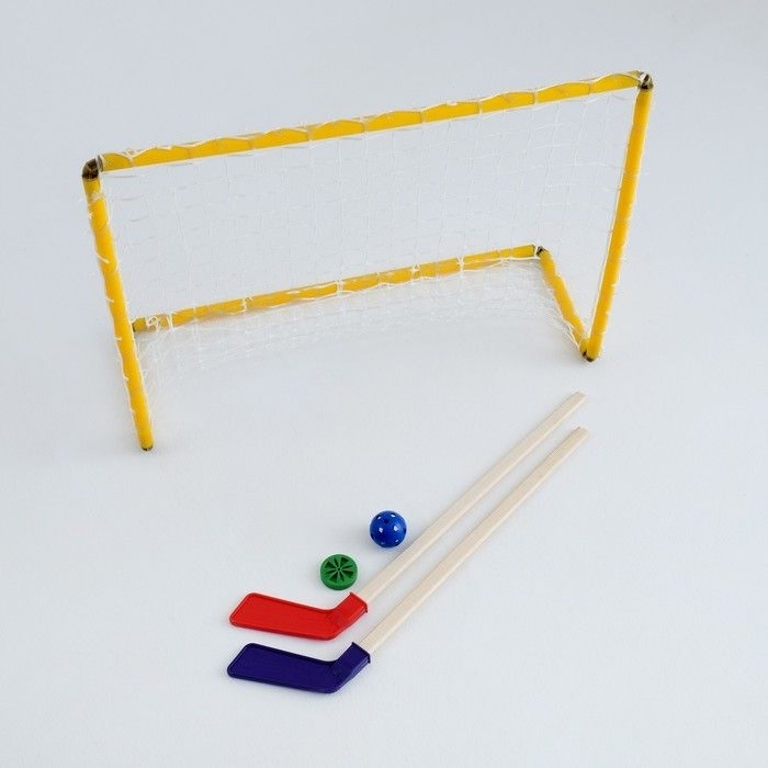 В комплекте 5 предметов: ворота, 2 клюшки, 2 шайбы.