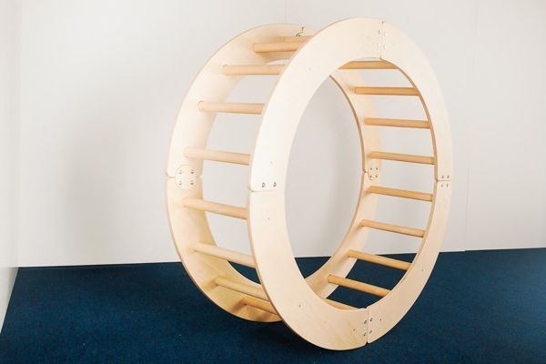 Колесо состоит из 4 частей, которые можно использовать в качестве отдельных игровых модулей, собрать из них мостик или качели. При катании в колесе ребенок сможет держаться за перекладины, что позволяет не прищемить пальцы.