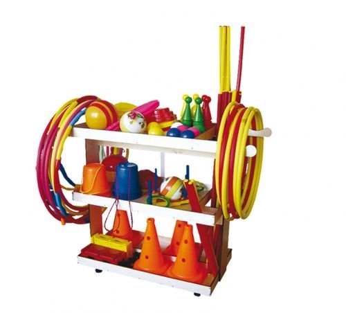 Спортивный комплекс готов к использованию во время занятий физкультурой. Подходит детям с ОВЗ. Предметы уложены в 3-хуровневую тележку на колесах. По бокам предусмотрены дополнительные держатели для хранения обручей.