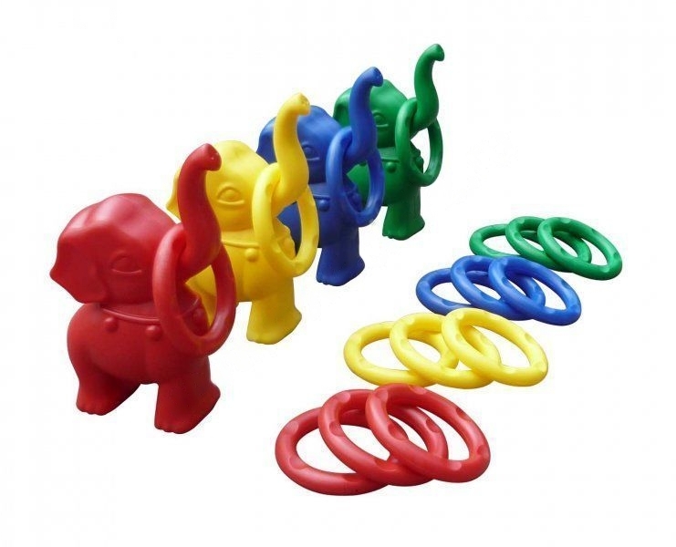 Кольцеброс Слонята состоит из четырех слоников разнообразной расцветки (красный, желтый, синий,зеленой) и шестнадцать колец для бросков. Универсальная игра, которая подходит как для проведения эстафет в детских садах.