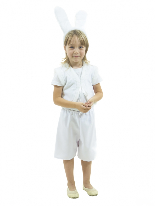 Жилетка выполнена из флисовой ткани, по краю пройм, полочек и низа оторочена полоской искусственного меха. Посажена на подкладку из хлопчатобумажной ткани. По низу спинки прикреплен хвостик. Шорты пошиты из белого габардина, в области талии присобраны на резинку. Дополнением карнавального образа является ободок, к которому прикреплены ушки в стоячем положении.