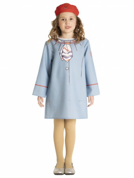 Костюм очень похож на форму проводницы, что позволяет ребенку примерить образ профессионала, поучаствовав в тематическом занятии или праздничном маскараде.