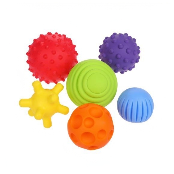 В наборе 6 шариков для развития сенсорного восприятия и цветоразличения, мелкой моторики и координации. Поверхности оснащены мягкими иголками, выемками, продольными углублениями, выступающими частями.