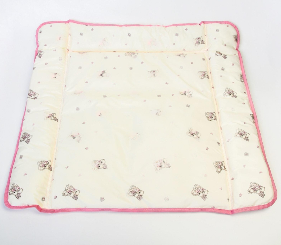 Детский матрас укладывается на комод или другую мебель для пеленания. Ткань с тематическим рисунком дополнена окантовкой. Вдоль верхней и боковых сторон предусмотрены мягкие отгибающиеся бортики. Изделие с поверхностью из ПВХ можно мыть.