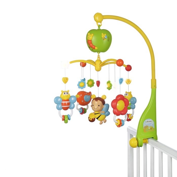 Устройство с заводным механизмом при помощи винта фиксируется над кроваткой ребенка. На подвесах закреплены разноцветные элементы со звуковыми эффектами и безопасным фигурным переключателем. Доступно 18 аудиодорожек. Игрушки оснащаются петельками, которые служат для стимуляции хватательного рефлекса. Мобиль способствует развитию слухового восприятия, зрительной и музыкальной памяти, цветоразличения.