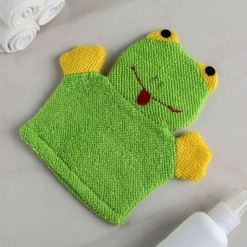 Мягкая детская мочалка для водных процедур выполнена в форме варежки, украшена изображением и дополнена петелькой.