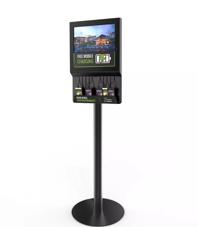 При помощи кабелей на пружинах осуществляется питание мобильных устройств. Одновременно с этим на экран выводятся объявления, указатели, презентационные тексты. Для подзарядки аккумулятора на 20% требуется от 15 минут, поэтому посетители успеют заинтересоваться контентом.