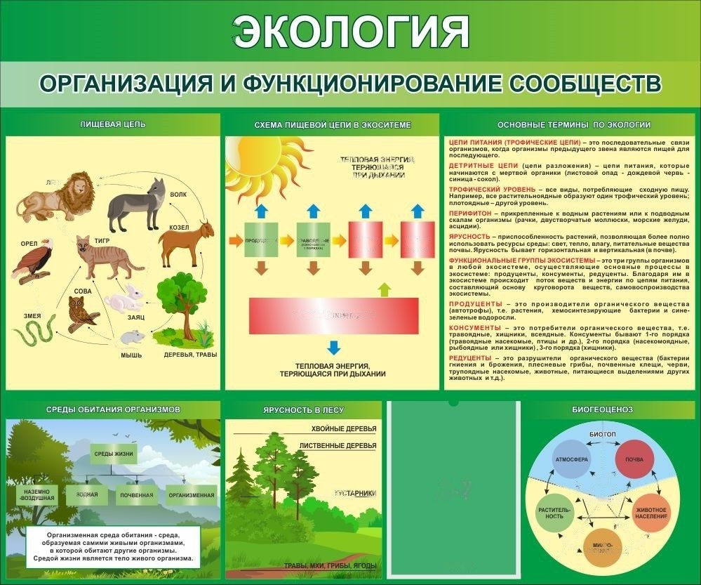 Стенд для уроков экологии и биологии рассказывает о живых сообществах. Текст разделен на тематические блоки с цветными схемами. Уделено внимание пищевым цепям, биогеоценозу, ярусности. Раскрыто значение 9-ти основных терминов из области экологии.