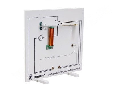 Магнит, пластина с пружиной и выключатель закреплены на изолирующей панели. Здесь же размещена схема цепей постоянного тока. Через клеммы подключаются источник питания и лампа.