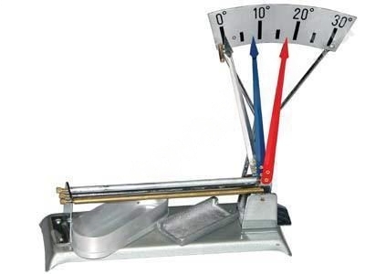 Прибор состоит из профильного металлического основания, на котором слева закреплен неподвижный упор с регулировочными винтами справа – обойма, в верхней части которой ось с тремя стрелками разного цвета: светлая, синяя, красная.