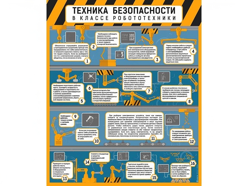 Стенд для класса робототехники содержит тексты о правилах поведения. На схеме показано как правильно обращаться с оборудованием, на что обратить внимание, каких ошибок избегать. Информационные блоки расставлены в логической последовательности и пронумерованы.