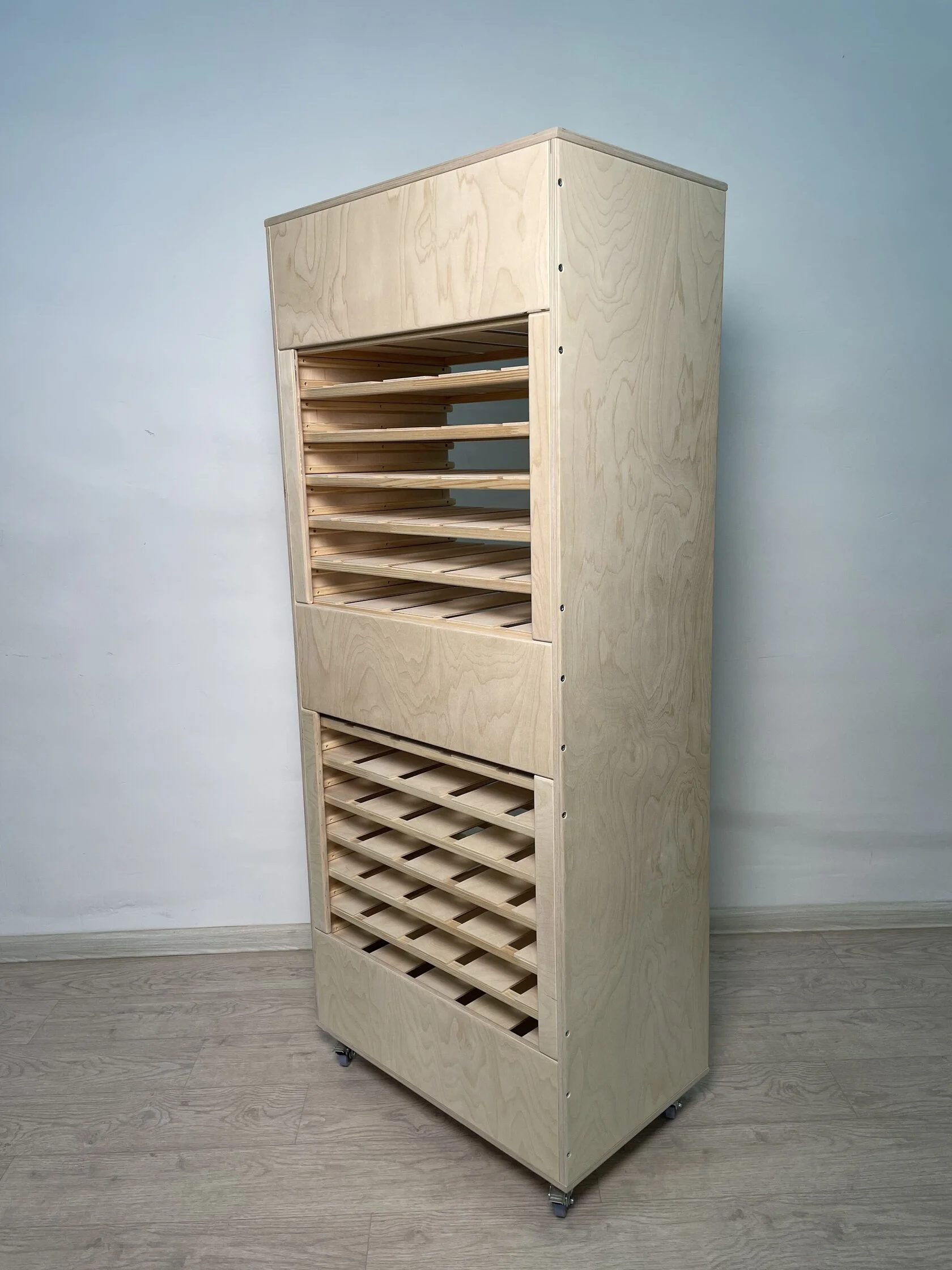 - 20 выдвижных полок позволят разместить большое количество рисунков