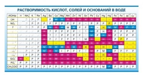 На стенде представлена таблица с данными о растворимости кислот, солей и оснований в воде. C помощью таблицы можно определить, как поведёт себя вещество в соляной или кислотной среде, возможно ли появление осадка.